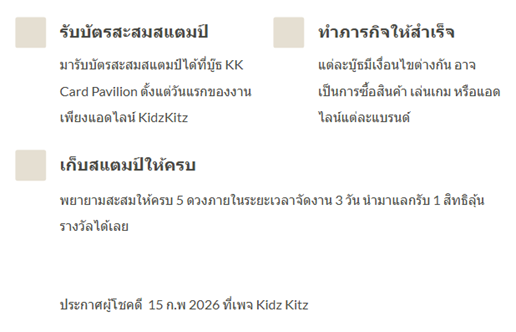 สะสมสแตมป์จากแต่ละบูธ (ตามเงื่อนไขของแต่ละกิจกรรม) เมื่อสะสมครบ นำมาแลกรับ KK Gift Set ที่บูธแวนการ์ดไทย