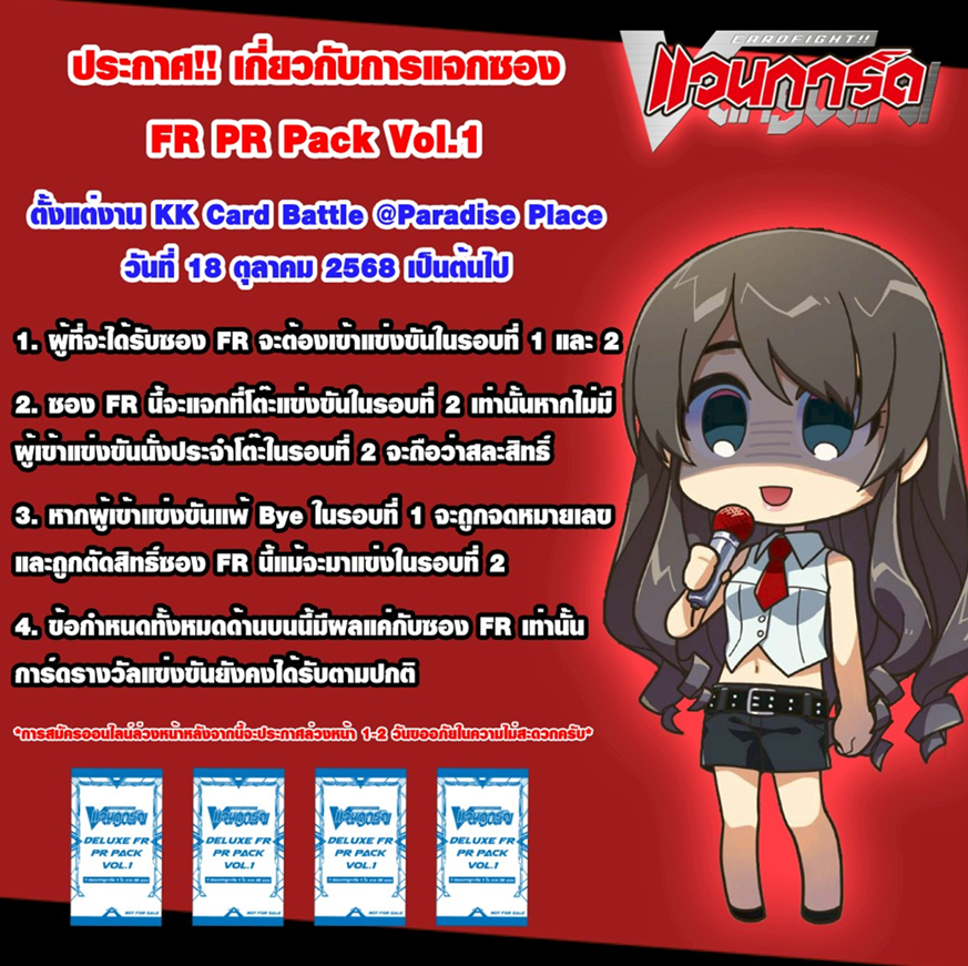1.เป็นการแข่งเดี่ยว เด็คที่ใช้เล่นจะต้องเป็นการ์ดแวนการ์ดเฉพาะการ์ดที่เป็นลิขสิทธิ์แท้ภาษาไทยเท่านั้น (ไม่สามารถใช้การ์ดภาษาอื่นปนในเด็คได้)